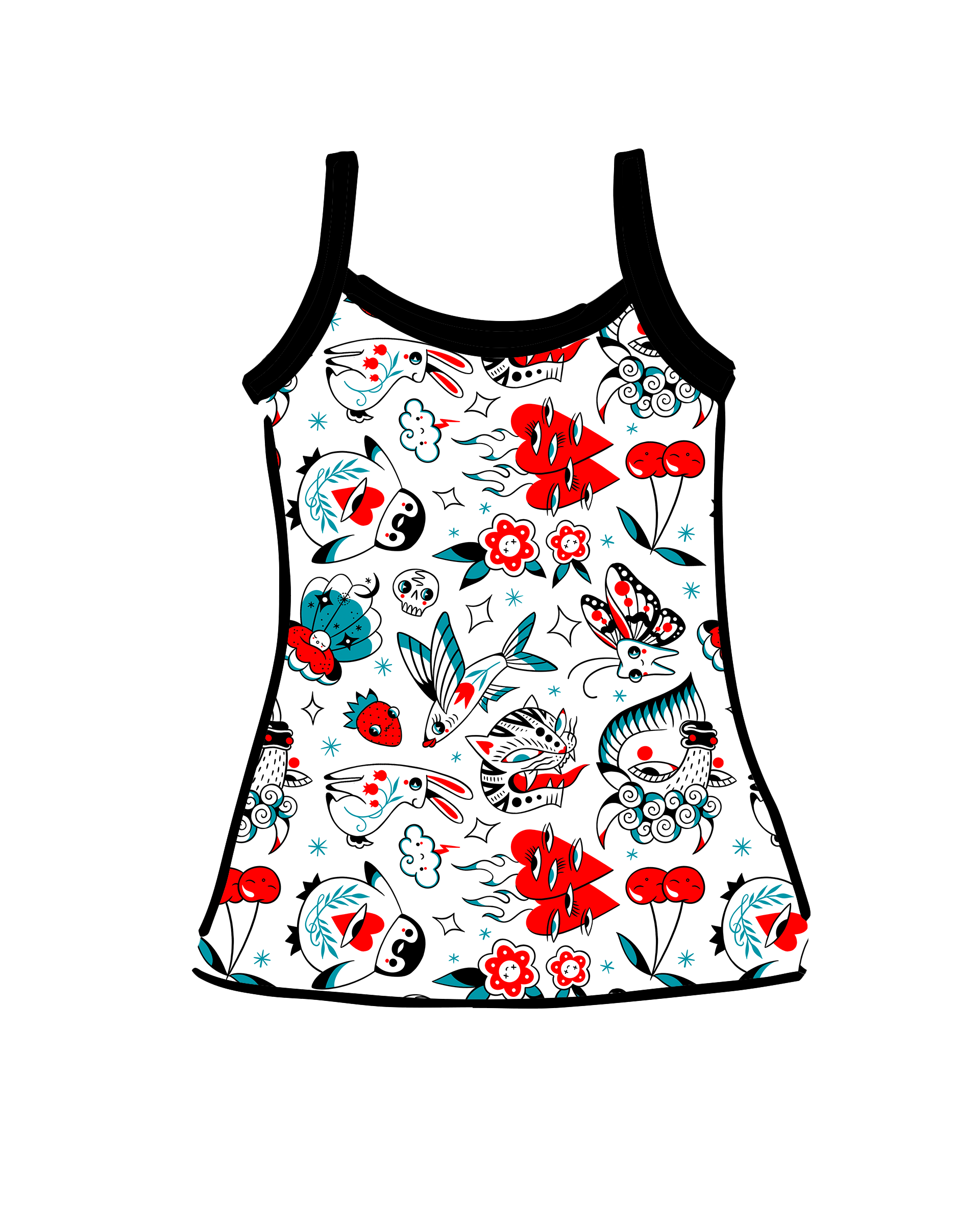 Drawing of Thunderpants Cami in Inked Up print - black, blue, and red tattoos.
