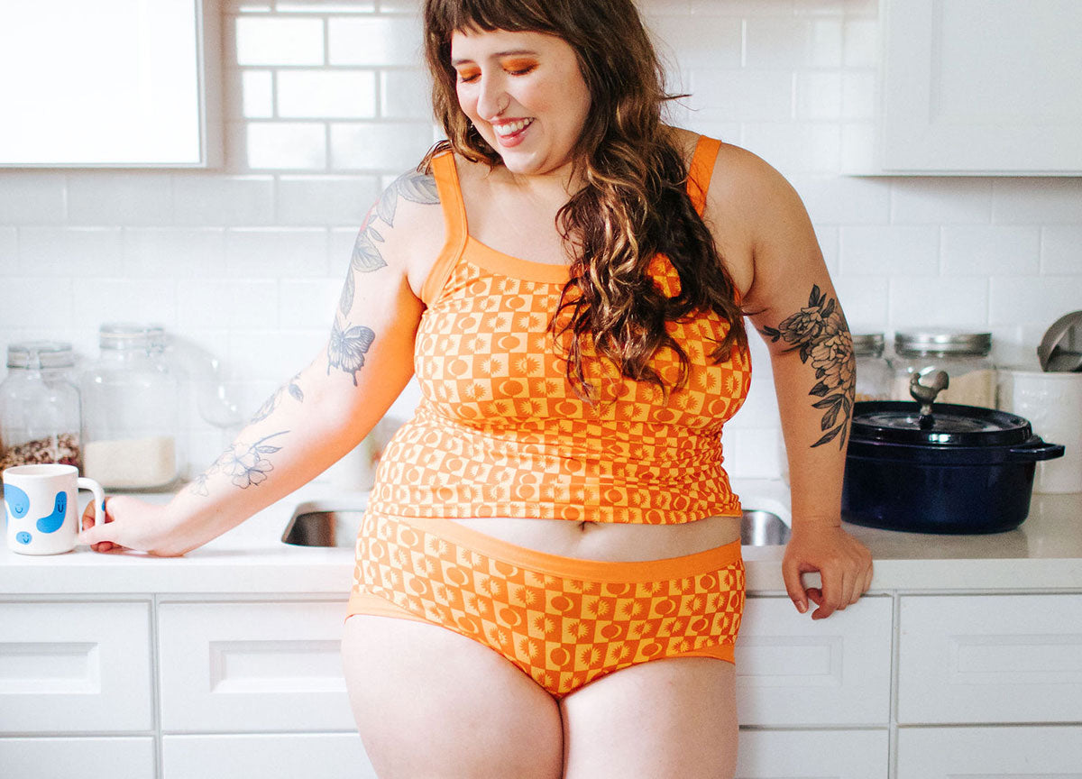 The Hipster is sized from XS-2XL and is designed to sit in the natural crease at the top of the leg, cover your bum, and reach to the hip. Made in Oregon with our custom 90% Organic Cotton / 10% Spandex blend fabric, they don't ride, roll, or bunch! We recommend the Hipster if you are flat in the tummy and/or short in the rise to the waist.