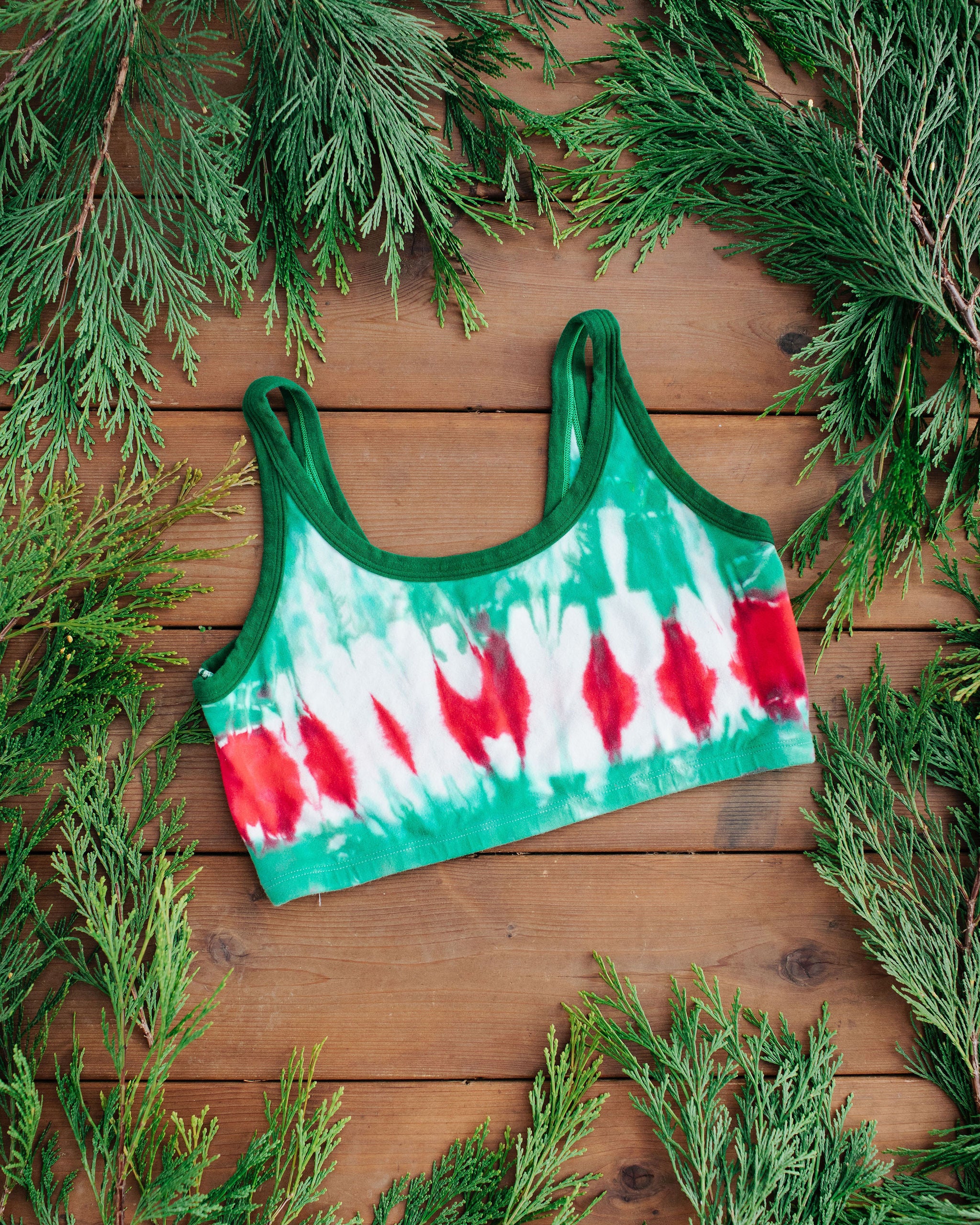 Our red and green Holiday Tie Dye is dyed in house and bound in Emerald Green. Add a little cheer to your rear!