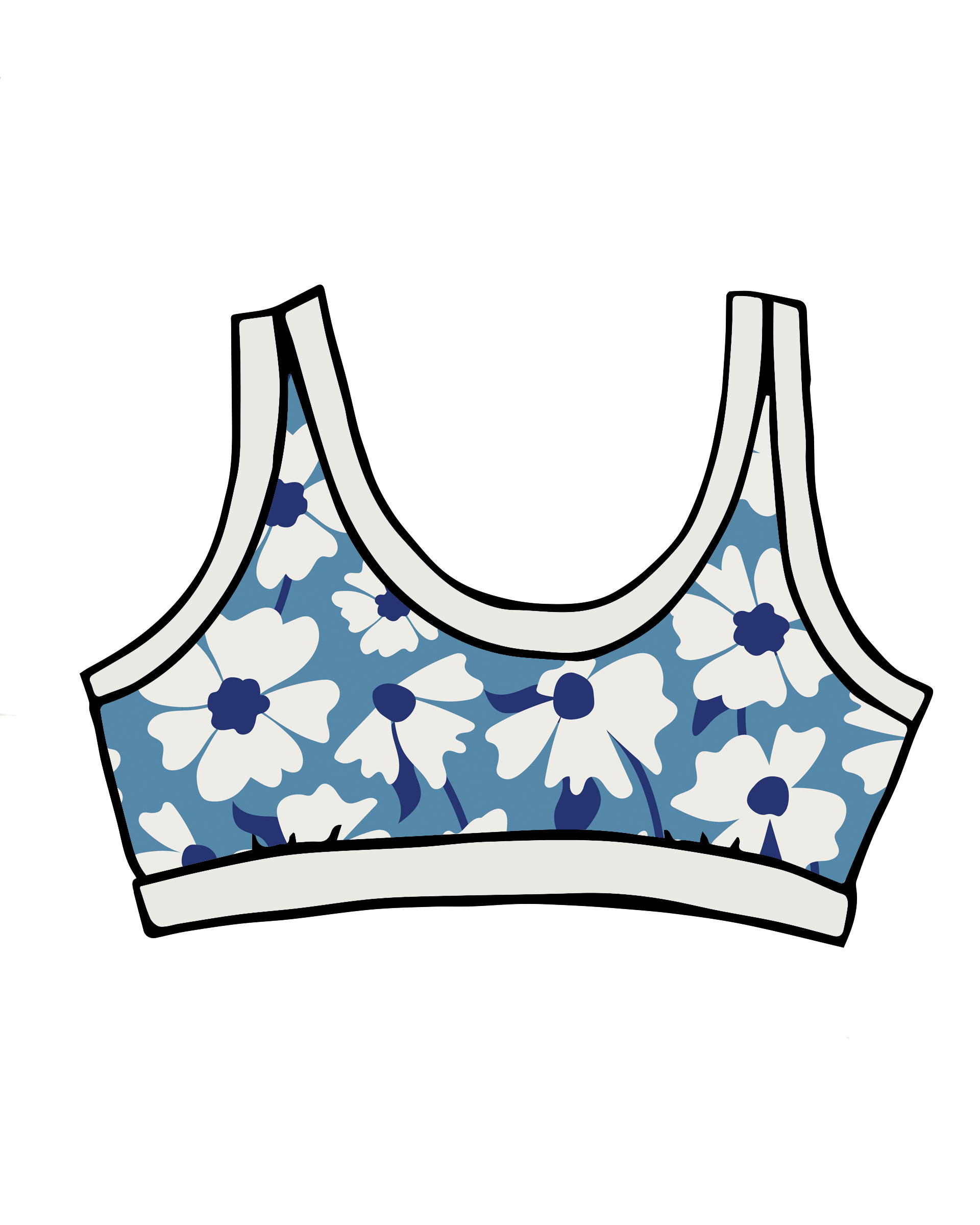 Drawing of Thunderpants Bralette in Moody Blooms - white and blue flowers with blue background.