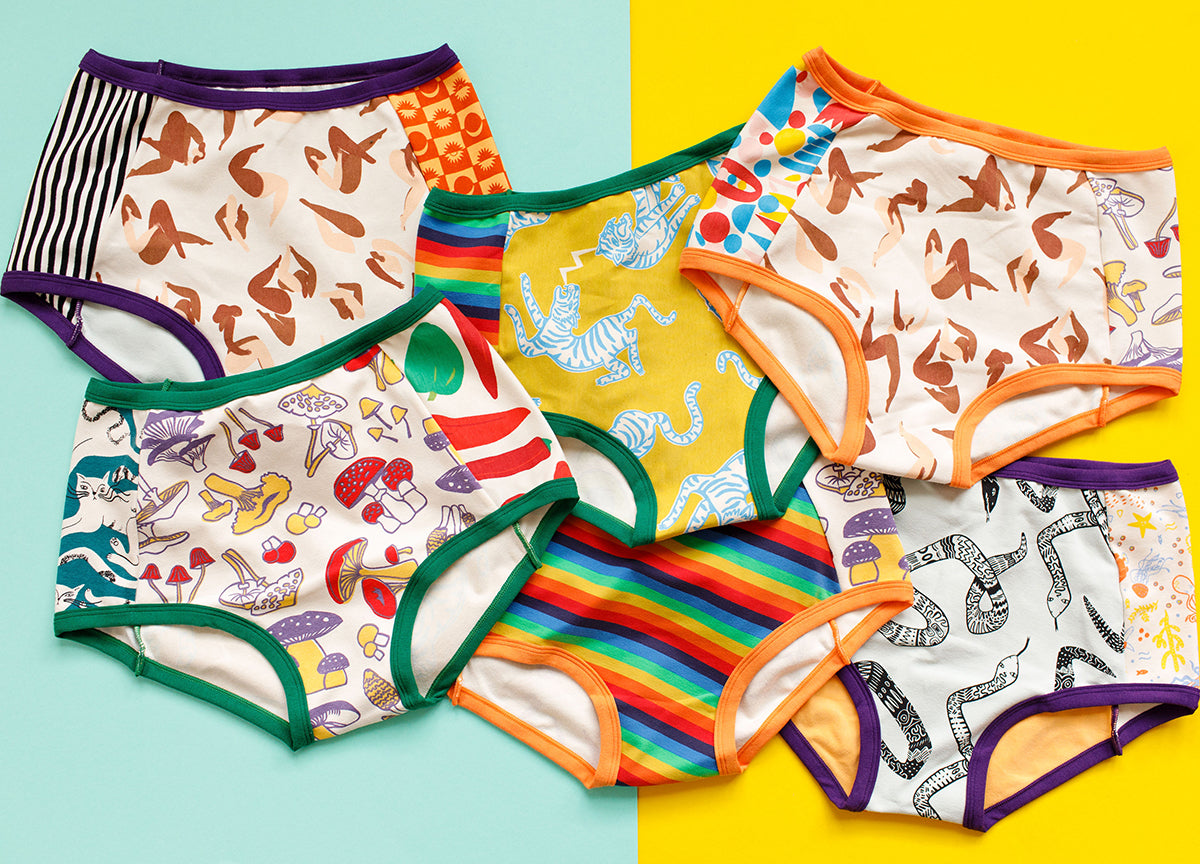 We make the Panel Pants with the scraps left over from our production! They are hand cut in our Portland office and sewn in a factory down the road. They have a similar fit as the Original, but with thinner binding and additional seams front and back. In sizes SM-4XL, this full brief sits in the natural crease at the top of the leg and usually hits just below the belly button. We release our most popular combo - the Scrap Panel Pant that is made with a random assortment of all our prints - once or twice a year.