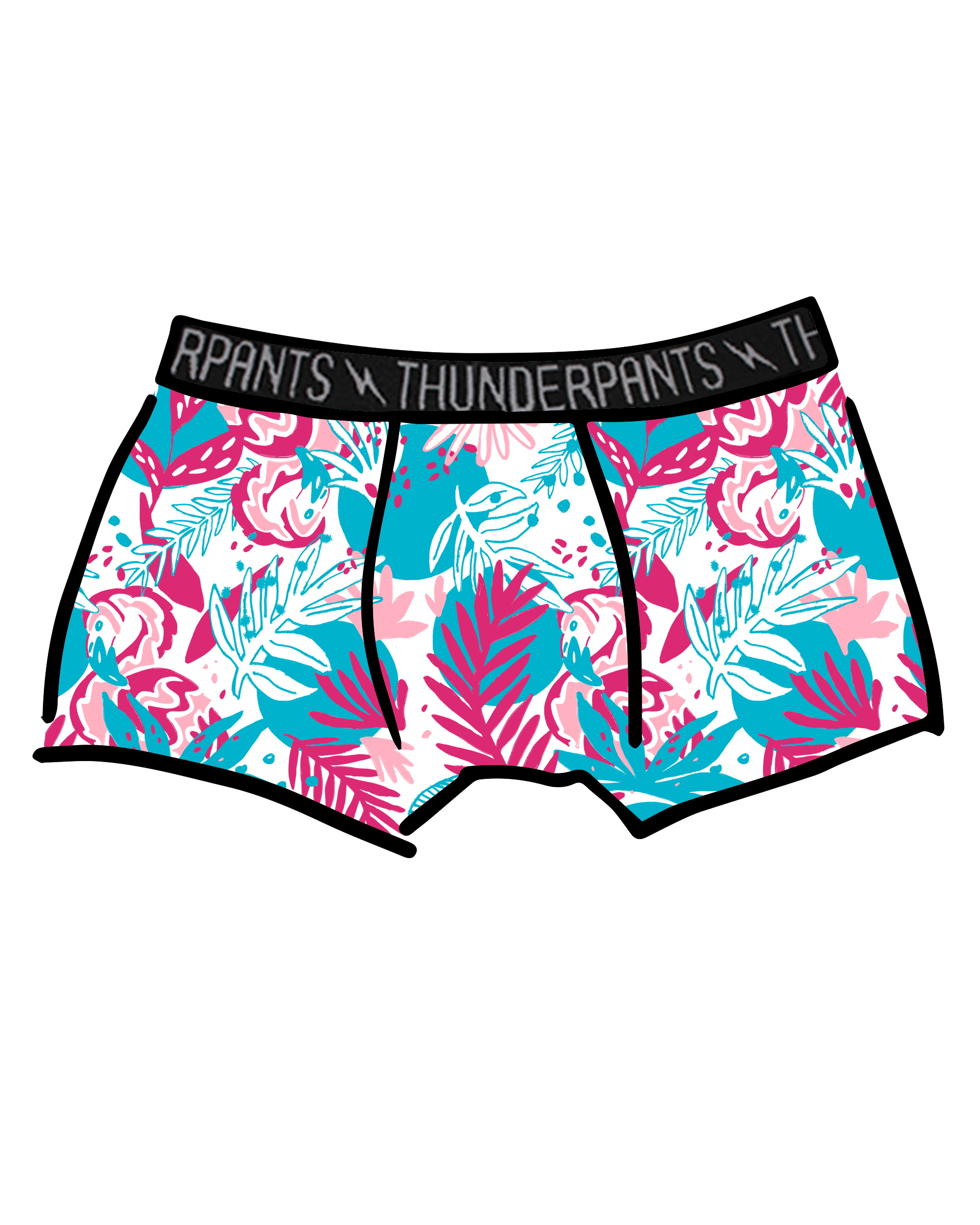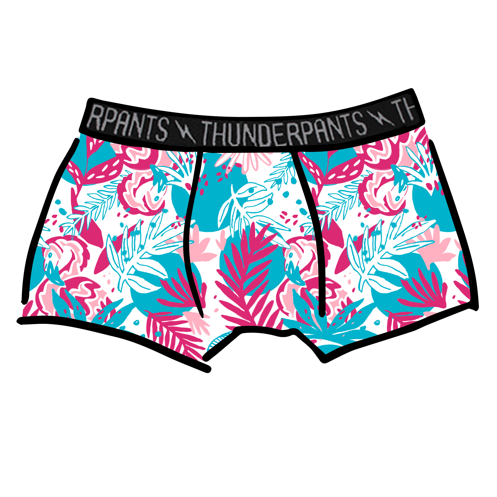 Drawing of Thunderpants Boxer Brief style underwear in Hot Pants print.